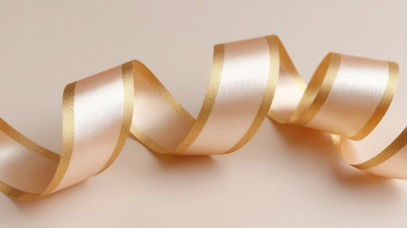 This image showcases an elegant gold trimmed satin ribbon gracefully swirling on a soft background. Perfect for crafts, decorations, and celebrations.