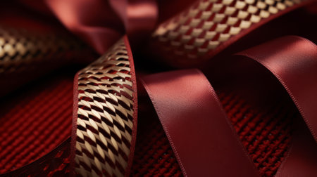 A detailed macro shot of the texture and pattern of a ribbon on a gift, highlighting the intricacy of the material,