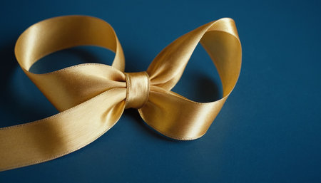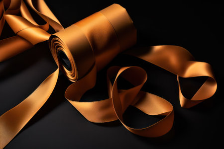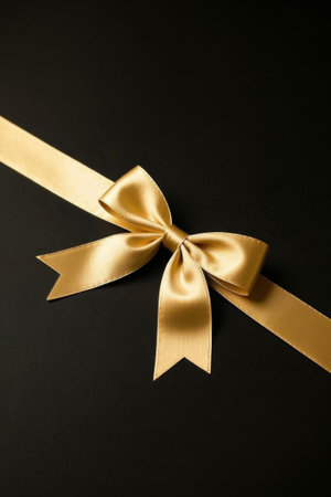 A close-up shot of an elegant gold ribbon elegantly draped over dark fabric, surrounded by soft sparkles, ideal for celebrations or crafts.