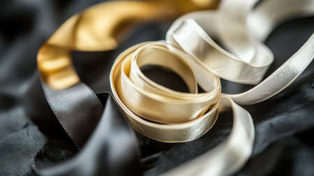 Close-up of elegant gold ribbons gracefully curling over dark luxurious fabric, surrounded by shimmering glitter, perfect for celebratory themes and backgrounds.