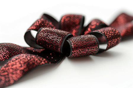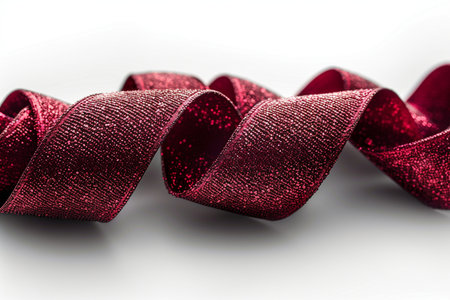 A close-up, detailed view of a vibrant red ribbon, sprinkled with glitter, curving gracefully on a plain white surface.