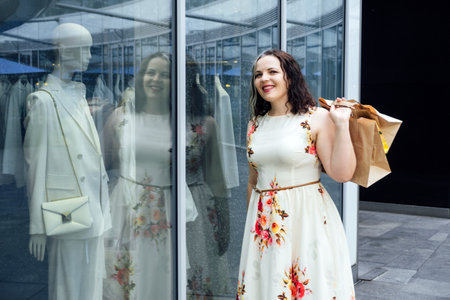 Future of Size Diversity. High street better at body diversity than luxury fashion. The lack of size diversity. Outdoor portrait of stylish curvy plus size woman with shopping bags.