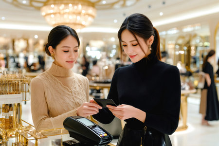 Elegant customer holding credit card, paying for purchase in luxury boutique, assisted by saleswoman