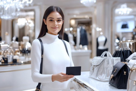 Young woman holding a black card in a luxury boutique, shopping for handbags