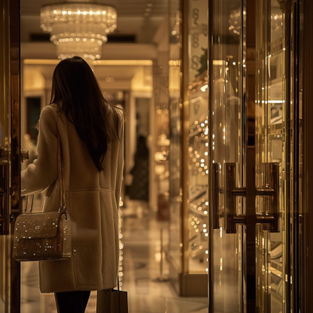 A woman, seen from behind, steps into an upscale boutique. The scene conveys an atmosphere of luxury with a radiant chandelier illuminating the sophisticated interior design and fashionable merchandise displays. The image captures a fleeting moment of elegance and style in an opulent environment.