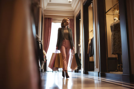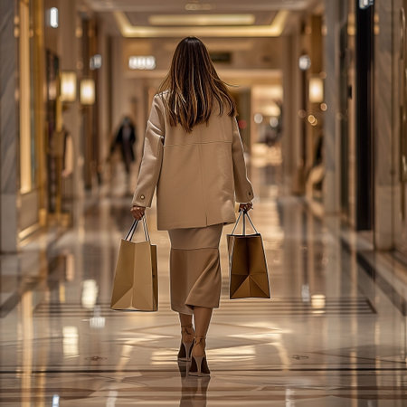 An elegantly dressed woman walks away down a polished hallway in a high-end shopping mall, carrying bags after a successful shopping trip. The image captures a moment of stylish consumerism and the allure of luxury retail spaces.