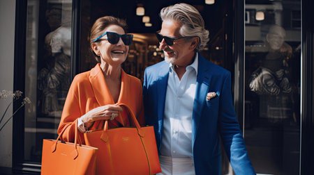 A stylish couple dressed in timeless yet modern attire exits a designer boutique. The woman's bag is a lively shade of coral while the man's is a vibrant shade of cobalt blue. Both are laughing heartily clearly delighted with their purchases.