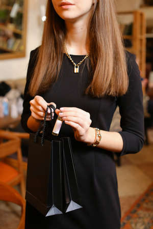 Close up shot of female hand holding black and red shopping bags isolated over light background