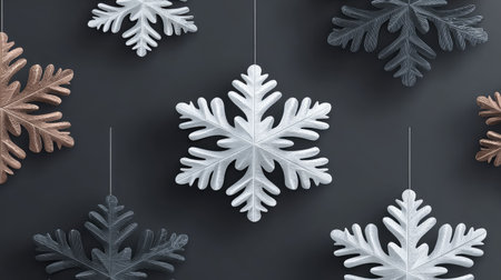 Group of stylized snowflakes in various metallic colors are hanging against a dark gray background. Each snowflake is detailed and has a textured, three-dimensional appearance.