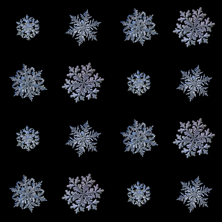 Snowflakes isolated on black background. Macro photo of real snow crystals: stellar dendrites with complex ornate shapes, long elegant arms, glossy relief surface and fine hexagonal symmetry.