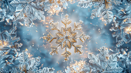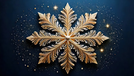 An ornate snowflake is detailed in gold and silver on a dark blue background. Tiny white and gold sparkles are scattered around the snowflake like stars.