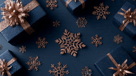 Decorative golden snowflakes are arranged on a dark blue surface. The composition suggests a festive or celebratory theme, possibly for the winter season. The lighting creates highlights and shadows, providing depth to the arrangement. This design could be utilized in various commercial or editorial applications.