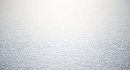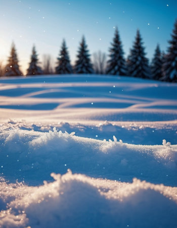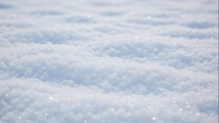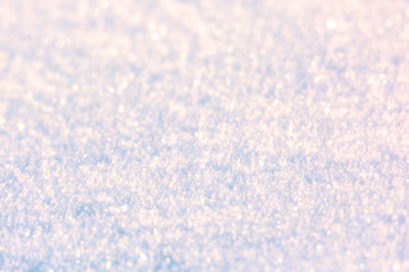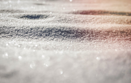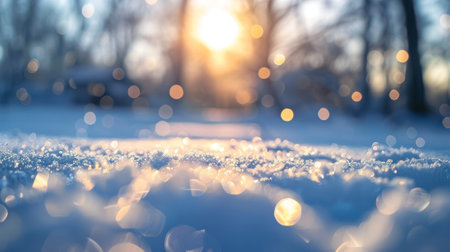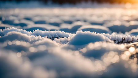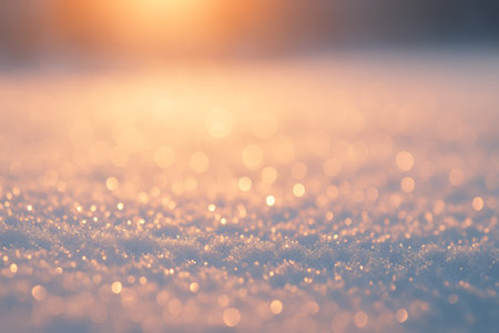 This stunning close-up captures the glistening texture of fresh snow under warm sunlight. The soft focus creates a tranquil winter atmosphere, perfect for seasonal themes.