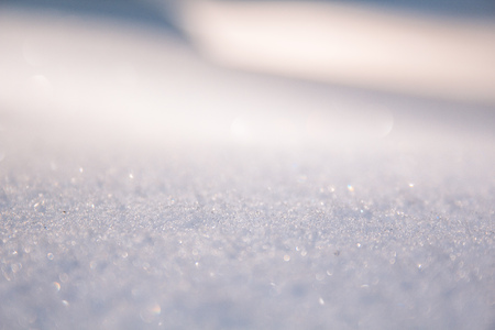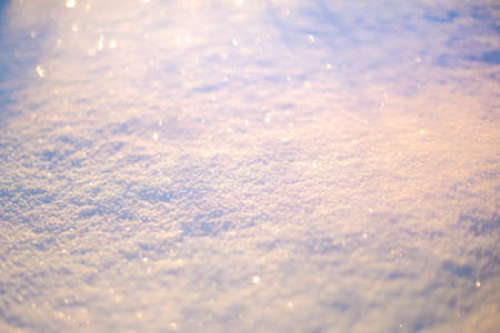 Snow background in close up. Surface of fresh winter snow in sunset ligh.