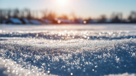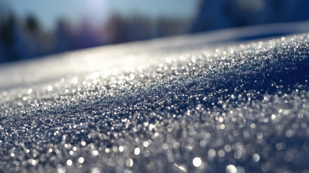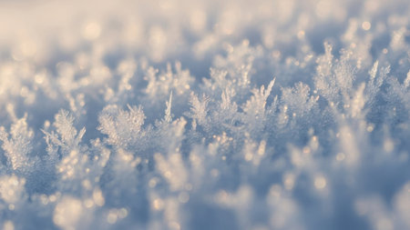 A stunning close-up view of a snowy surface glittering under sunlight. The frost creates a captivating scene of tranquility, showcasing the beauty of winter outdoors.
