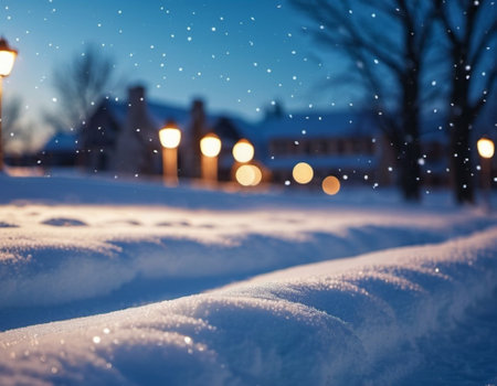 Cute Christmas night landscape covered with fresh snow. Wonderful winter village. New Year Christmas atmosphere. Festive enchanting winter wonderland. Snowflakes, snowdrifts and hills. AI generated.