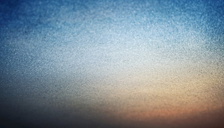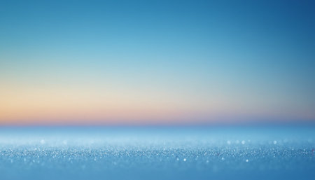 A close-up, macro view of a frosted surface, possibly ice or snow, with tiny sparkling crystals catching the light. The background a soft, smooth gradient of blues transitioning to a pale orange hue, suggesting a sunrise or sunset. The shallow depth of field creates a gentle bokeh effect, emphasizing the delicate texture of the foreground. The overall mood is serene, peaceful, and tranquil, evoking a sense of crisp, cool winter air.