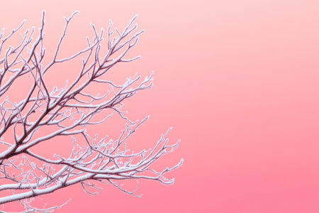 Frost laden branches create intricate patterns silhouetted against a gentle pink sunrise. The cold morning air adds a serene quality to this winter scene filled with delicate beauty.