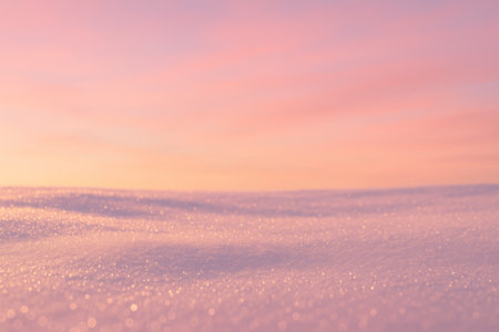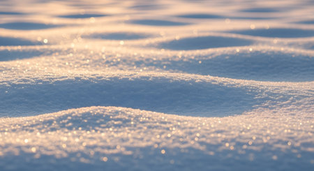 A serene and peaceful winter scene featuring a blanket of snow with undulating patterns, illuminated by the warm glow of sunlight that brings out the sparkle in the ice crystals.