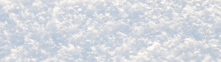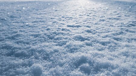 Sparkling white snow crystals covering ground wintertime close up. Texture of smooth surface covered soft snow at sunlight. Beautiful snowflakes shining on winter cold sunshine. Natural pattern.