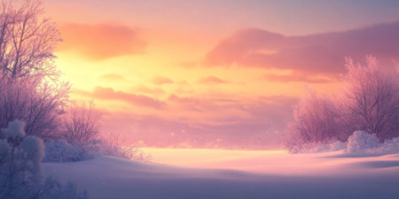 A gentle pink sunset illuminating a snowy landscape with sparkling frost for winter vibes