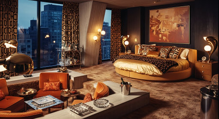 A luxurious living room with modern furniture, large windows showcasing a city skyline at night, warm lighting, and decorative elements like candles and fruit bowls