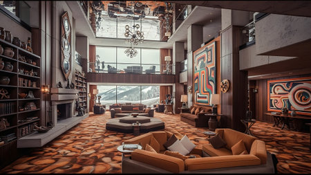 A luxurious mansion with large windows overlooking the sunset, adorned with ornate curtains and elegant furniture. The sun casts warm hues across the room, creating an atmosphere of opulence and grandeur. Photorealistic style, shot in high resolution using a Canon EOS R5 camera with a wide-angle lens for a panoramic view. --chaos 30 --ar 16:9 --v 6.1 Job ID: 5a7940cf-6bf2-422e-9569-20273c292f65