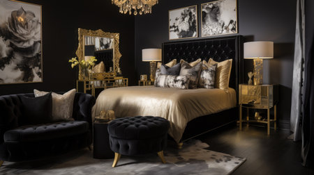 A luxury bedroom featuring a large, comfortable bed with an ornate headboard, golden accents, and soft lighting.