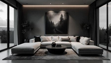 black luxury living room wall art illustration landscapes sophistication, elegance decor, design style black luxury living room wall art