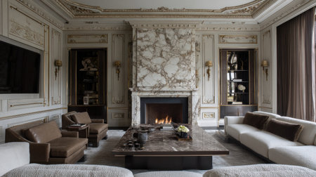 Luxury living room interior with fireplace, leather sofa and armchairs