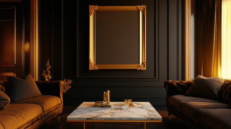 Sophisticated living room with framed ISO A poster mockup hanging above a velvet sofa, contemporary lamps, polished finishes, 3D render with textured base