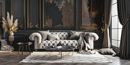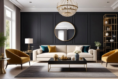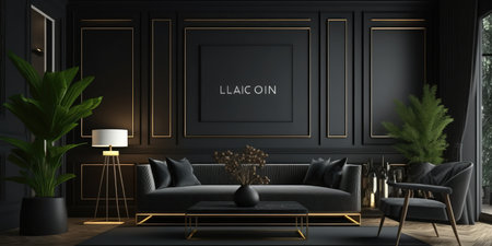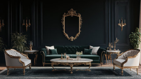 Interior Luxury Living Room with Emerald Velvet Sofa, Black Wall, and Gold Accents