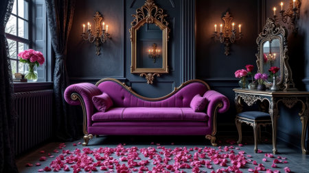Luxurious dark victorian room with purple sofa and pink roses. That the image is generated using AI.