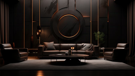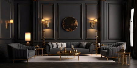 Black sofa and armchairs against black classic paneling wall. Art deco style interior design of modern living room
