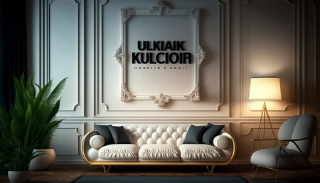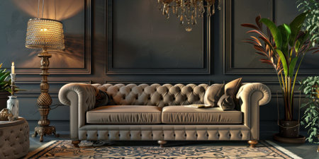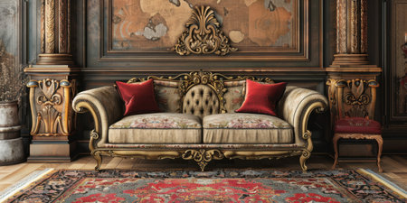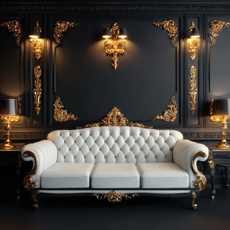 A classic white sofa is the centerpiece of a room featuring dark walls and elaborate gold decorations. The scene is illuminated by lamps and wall sconces, suggesting an interior setting with rich textures. This image could be used for design, home decor, or luxury lifestyle themes, offering a sense of opulence.