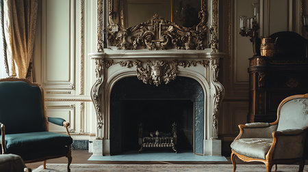 Opulent living room featuring ornate wall paneling, a fireplace, and a luxurious chesterfield sofa