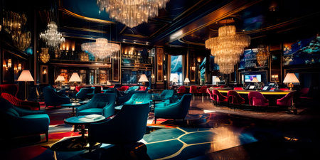 sophisticated and classy casino lobby with glitzy chandeliers, velvet seating, and a glamorous ambiance. Generative AI