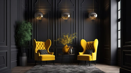 Colors of the year 2021, an elegant dark grey decor with brilliant yellow sofas. Generative Ai