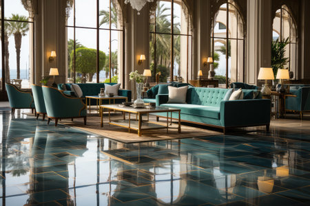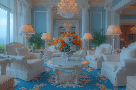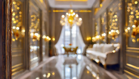 A stunning luxury hotel interior showcasing elegant design, stylish decor, and a welcoming atmosphere with blurred bokeh lighting. Ideal for creative projects, advertising, and upscale design
