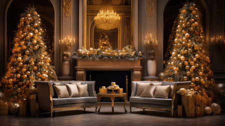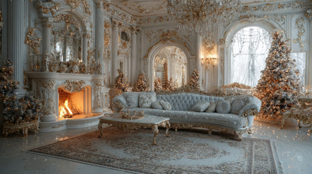 A luxurious living room adorned with intricate details and festive decorations for the holiday season, featuring Christmas trees, elegant furniture, and soft lighting.