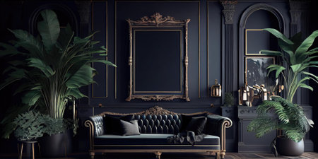 Classic interior with empty frame on wall. Mock up, 3D Rendering
