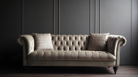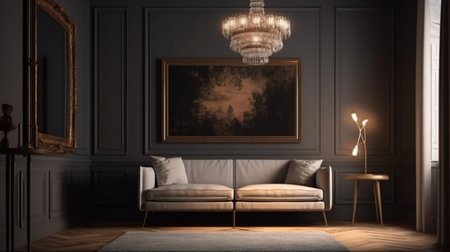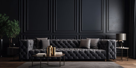 Dark living room interior with luxury gray sofa. distinct generative AI image.