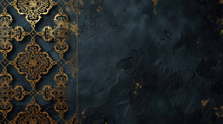 Exquisite gold Islamic patterns adorn a dark textured backdrop, exuding elegance. Islamic Arabic Arabesque Ornament Border Luxury Abstract black Background with Copy Space