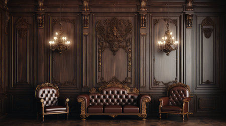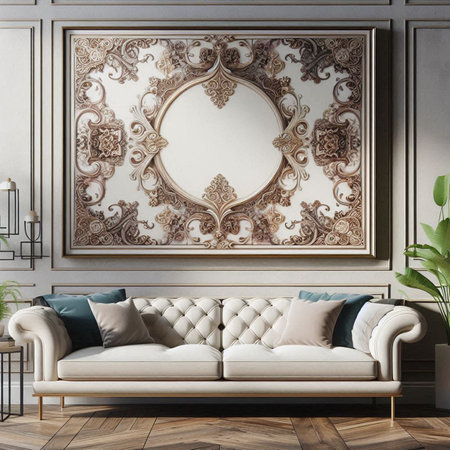Luxury sofa in classic interior with decorative ornament. 3d render