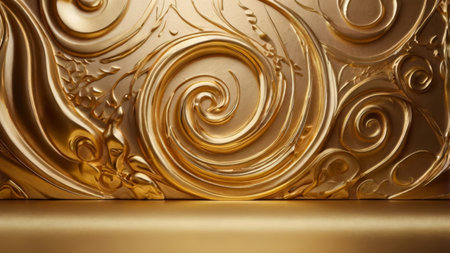 Elegant and luxurious product showcase background. Bright golden hues dominate the scene, creating a rich and opulent atmosphere. Soft, warm lighting enhances the golden glow. Abstract swirls and patterns in various shades of gold add depth and texture. The overall design is sleek and modern, perfect for displaying high-end products.