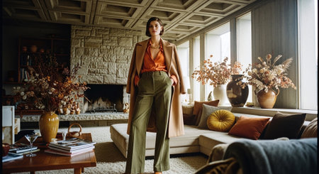 Fashionable young woman in a brown jacket and pants posing in the interior of the apartment.