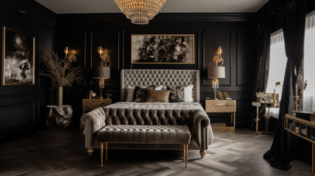 Bedroom decor, home interior design . Art Deco Glam style with Ornate Chandelier decorated with Brass and Velvet material . Generative AI AIG26.