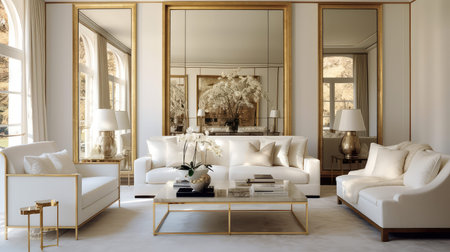 Interior of luxury living room in classic style. Sofa, armchair, coffee table, mirror and armchair.
