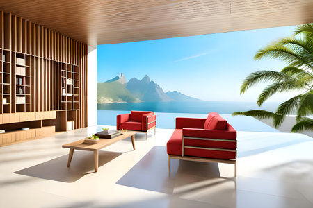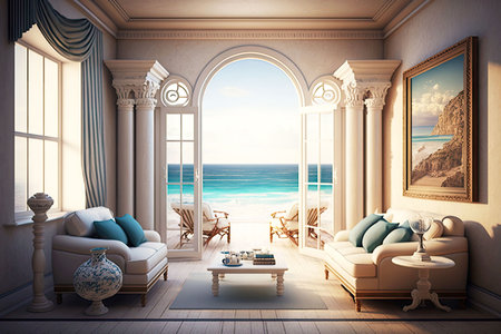 room with sea view in luxurious beachfront villa interior, generative ai