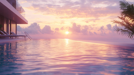 Sea view swimming pool in modern loft design,Luxury ocean Beach house,sunset, 3d rendering